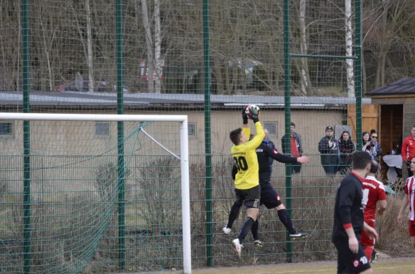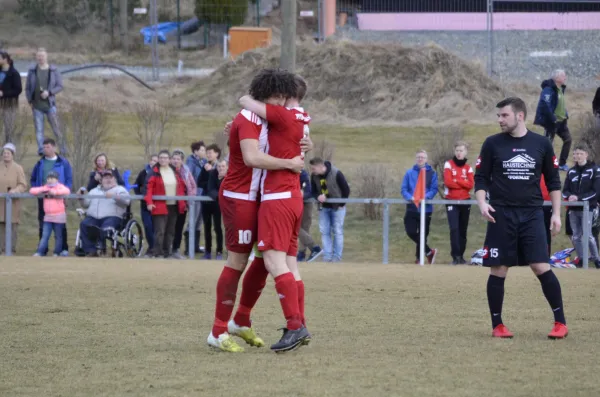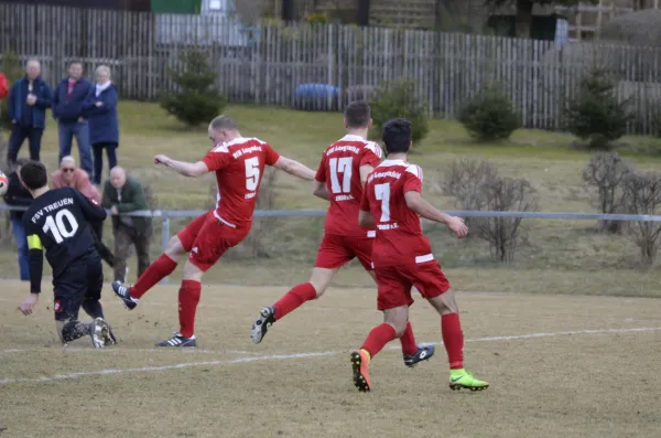 Nach der enttäuschenden Leistung aus der Vorwoche, war unser Team beim Auswärtsspiel in Treuen kaum wieder zu erkennen. Mit einer deutlichen Leistungssteigerung und dem nötigen Biss konnte man einen enorm wichtigen Dreier im Abstiegskampf einfahren. Bereits nach 4 Minuten durften unsere Farben das erste mal Jubeln. Herzog, frei durch, schob überlegt zur Führung ein. Dieser Treffer zeigte zunächst Wirkung bei den Gastgebern, doch nach 10 Minuten und einem misslungenen Klärungsversuch konnte Treuen den Ausgleich erzielen. Hatte man durch den Ausgleich in der Vorwoche noch den Faden verloren, zeigte man sich diese Woche anders und glaubte weiter an einen Erfolg. Und so wurde man in der 28. Minute belohnt. T. Rudolph war per Kopf zur Stelle und ließ Rausch keine Chance. Treuen wurde nun spielbestimmender, doch wirklich zwingendes kam nicht heraus. Wenn es gefährlich wurde, dann durch Standards. Es ging also mit der knappen Führung für unseren VfB in die Pause.