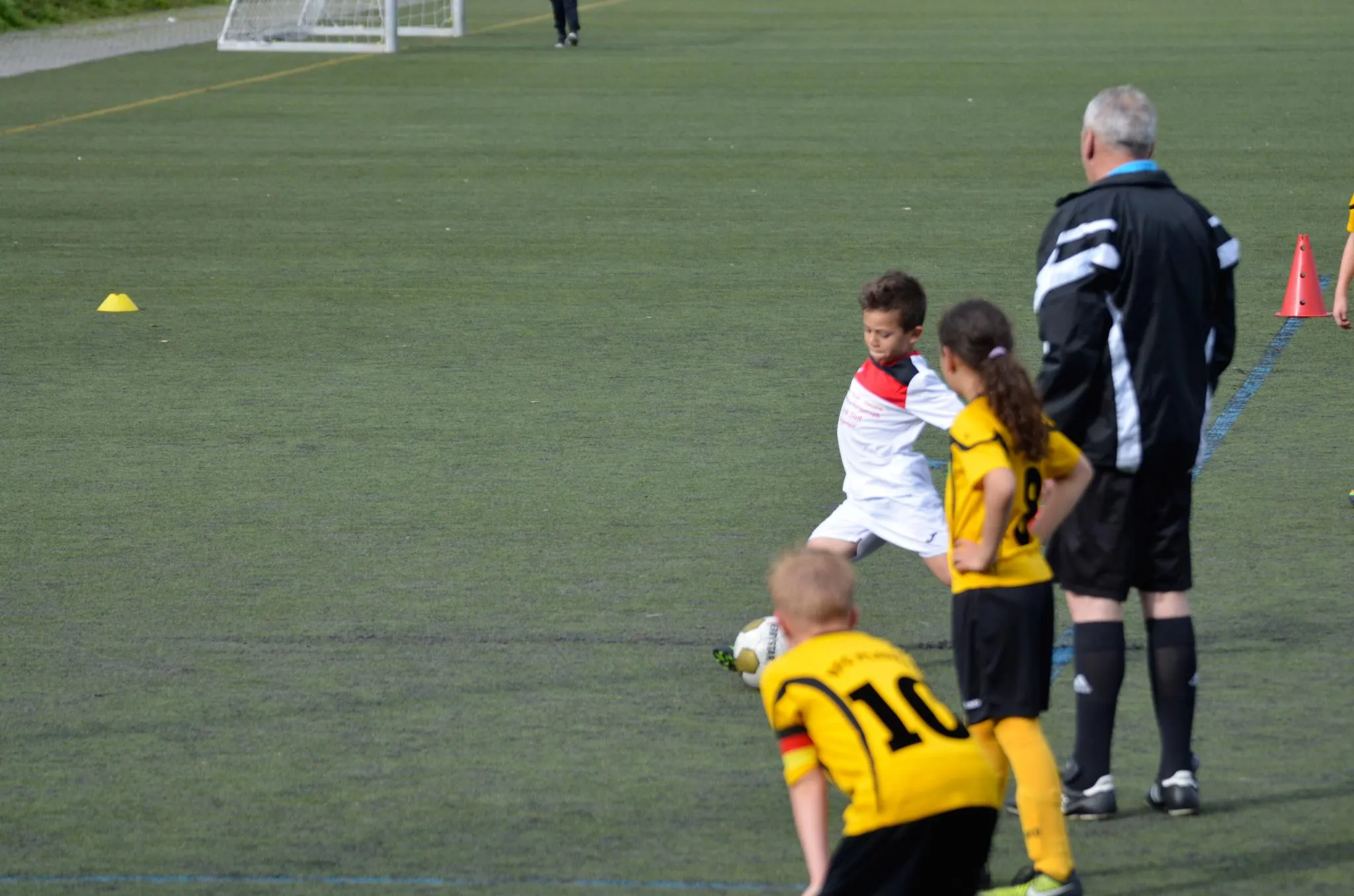 Kaum wurde vom Schiedsrichter dann angepfiffen, war das auch alles gleich wieder vergessen. Und wir stellten uns, identisch zur Vorwoche, wieder wie die ersten Autos an. Keine Teilnahme am Spiel, kein Wille, kein Zweikampf-Verhalten. Nichts! Wir schauten brav zu und leisteten höchstens etwas Geleitschutz. Folgerichtig stand es dann nach 3 Minuten auch gleich 2:0. Völlig verdient, denn für so eine passive Spielweise muss man einfach bestraft werden. Vom Rückstand aufgewacht, spielten wir dann doch noch mit und konnten unsere Hanna im Tor mehr entlasten. Nun sollten wir auch vors gegnerische Tor kommen, sogar zweimal sehr aussichtsreich, doch Mattis vergab beide Hochkaräter mit einem Schuss knapp neben das Tor. Dennoch waren wir nun endlich besser im Spiel und hielten auch mal dagegen. Schwer machten wir uns das Spiel demnach meist selbst, in dem immer wieder leichtfertige Ballverluste in der Offensive zu gefährlichen Kontern führten, welche viel Kraft nach hinten forderten.