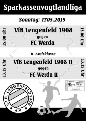 Am Sonntag, den 17.05.2015 um 15 Uhr empfängt der VfB Lengenfeld den FC Werda.Im vorletzten Heimspiel will unser Team den theoretischen Kassenerhalt mit einem Heimsieg perfekt machen. Beim Punktgewinn in Wernesgün tat man sich doch recht schwer. Beim Versuch das Ergebnis zu verwalten blieb man doch einiges schuldig. Dass die komplette Innenverteidigung ersetzt werden musste, kann man nur bedingt als Grund ansehen. Nach der Führung durch Wernesgrün ging ein kurzzeitiger Ruck, bis zum Ausgleichstreffer, durchs Team. Im Heimspiel gegen Werda muss die Mannschaft über die komplette Spielzeit wieder an ihre Leistungsgrenze gehen um erfolgreich zu sein.