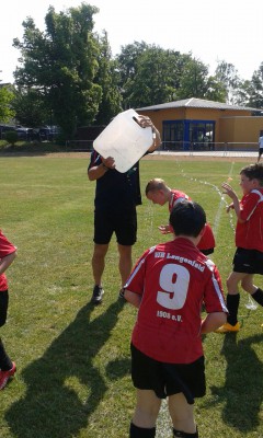 Es war eigentlich viel zu warm um Fußball zuspielen, aber die Eltern hatten vorgesorgt und einen großen Wasserkanister mit genommen. So konnten schon in der Aufwärmphase die Gemüter abgekühlt werden.