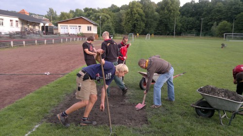 Ab kommenden Dienstag, den 05.07.2011 ist der Rasenplatz wegen Ausbesserungsarbeiten gesperrt. Am letzten Donnerstag wurde bereits damit begonnen die schadhaften Stellen für die Verlegung mit Rollrasen vorzubereiten. Dies geschah mit tatkräftiger Unterstützung der beiden Lengenfelder Hausmeisterdienste Mario Hofmann und Manuel Prause. An dieser Stelle ein herzliches Dankeschön. In Zusammenarbeit mit Spielern des VfB wurde gute Arbeit geleistet. Am Dienstag soll nun der Rollrasen verlegt werden und es werden wieder fleißige Helfer benötigt. Wer es ermöglichen kann sollte sich melden