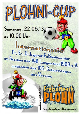 Am kommenden Samstag, den 22.06.13 begeht der VfB Lengenfeld sein 105-jähriges Bestehen. Trotz Überflutung des Stadions und die damit verbunden Zerstörungen hat sich der Verein dazu entschlossen, den geplanten Internationalen „Plohni Cup“ mit 2oo Kindern durchzuführen.
